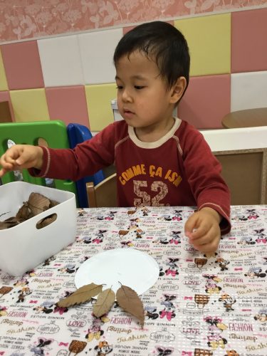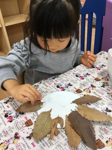 今週は落ち葉拾いで拾った落ち葉を使いりんご組さんはお製作を