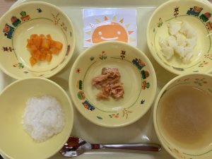 粥 味噌汁 魚の西京焼き ゆでにんじん ゆでじゃがいも