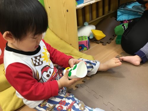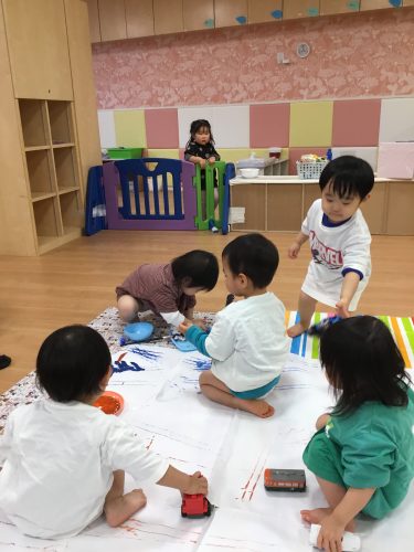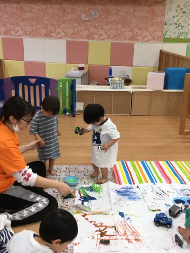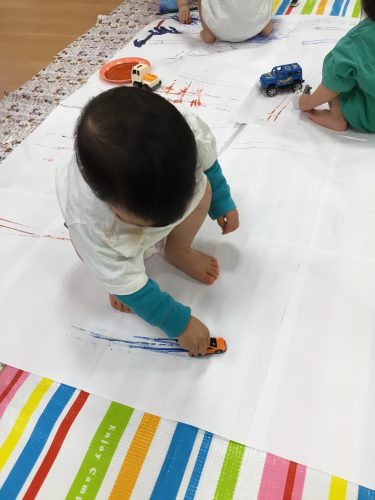 1歳児さんはミニカーのタイヤを使って模様をつけていました![]()