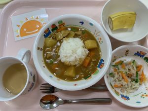 ※カレーライス大好き~いただきま~す!!と元気な声が聞こえてきて、嬉しかったです。いい気分でワクワクしながら楽しく食べれたら、栄養吸収がアップするなどと言われています。卒園、進級まであと少し、給食の時間も大切にしていきたいと思います。