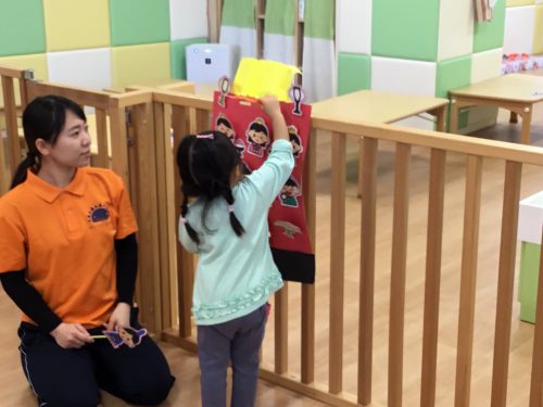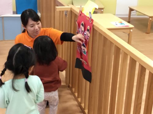 女の子に手伝ってもらいながら、ペープサートのひな人形を