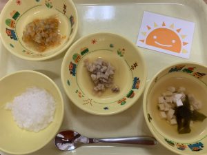 粥 すまし汁 魚煮 二色煮びたし オレンジ