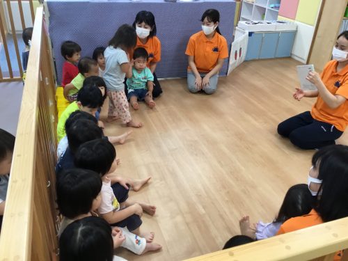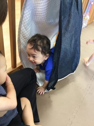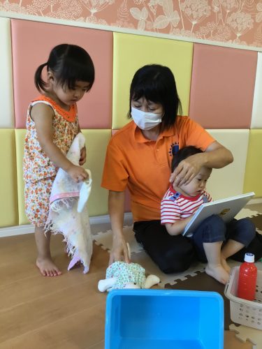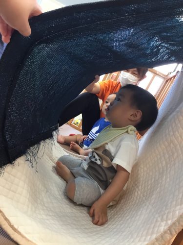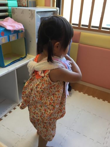抱っこしてお人形の寝かしつけ中・・・静かに静かに・・・
