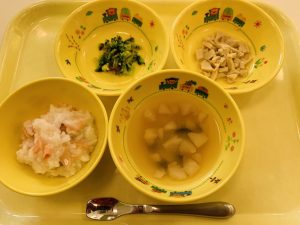 鮭粥 味噌汁 高野豆腐の煮物 ブロッコリーのおかか和え