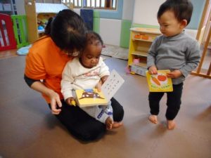 保育者のお膝で見る絵本も大好きです![]()