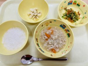 粥 鶏ひき肉と野菜のスープ煮 きゅうりとにんじんのおかか和え バナナ