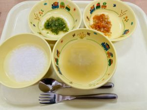 粥 味噌汁 じゃが芋のそぼろ煮 キャベツのごま和え オレンジ