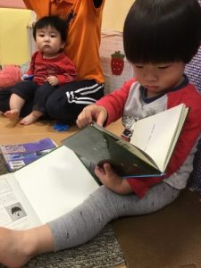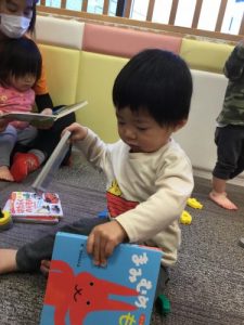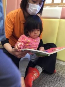 読み聞かせをしている保育者の真似をしたり、、