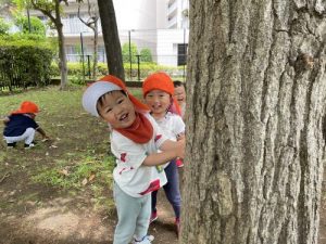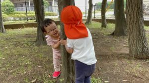 お友達と木の陰から「ばぁ