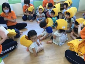 火災想定の訓練の中、子ども達は防災頭巾をかぶって