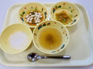 粥 豆腐の煮物 キャベツの煮浸し みかん缶