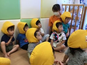 掛け声に合わせてほっぺを膨らませたりと子どもたちも真似を