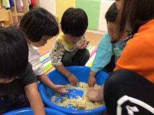りんご組さんは、パン粉の感触遊びを楽しみました?