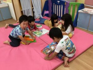 絵本を読む時も、みんなで輪になっているくらい仲良しなようです?