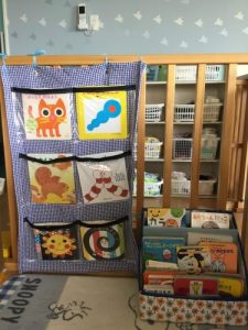 ?もも組さんの絵本コーナーは、表紙が見えるようにずらり。