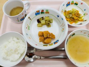 ※今日は、「お野菜も食べようね」「全部食べよう!」と、子どもたちで励まし合いながら食べていて、ほのぼのとした給食の時間となりました♪