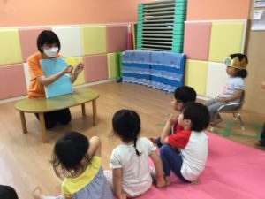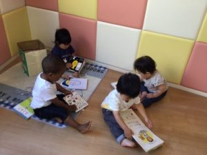 「貸して」「いいよ」のやり取りも聞こえるようになり、お友達と絵本を交換しながら読んでいる子どもたちです?