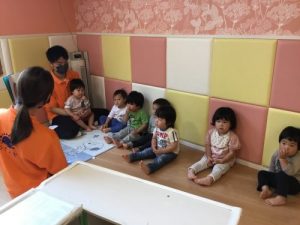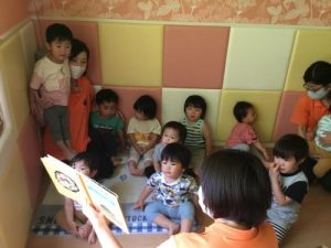 後ろのお友達にも見えるように、みんなで座って絵本を読みます!