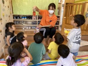 子どもたちが釘付けになっていたのは、透明な水に色がつく、マジックショー‼️