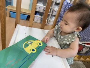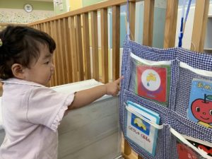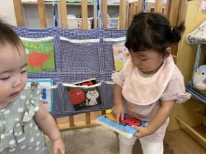 自分で絵本を選んで「よんで♡」と保育者のお膝をゲット。