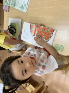 りんご組さんは、わざと絵本を逆さまにして、お友達に読んであげています![]()
