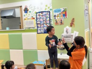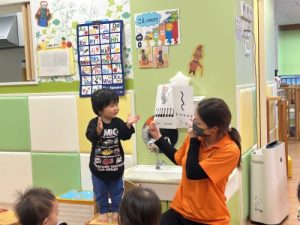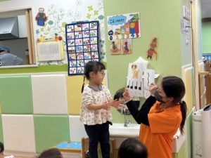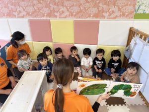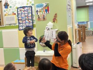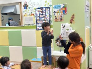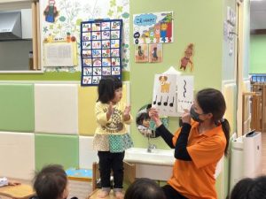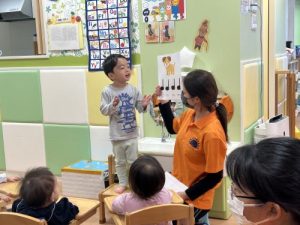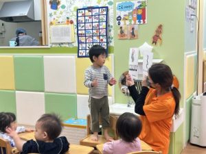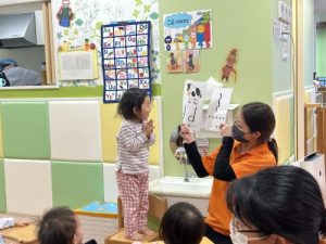 今月のリトミックでは、動物の鳴き声と一緒に手拍子で拍をとります。