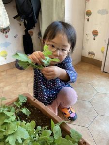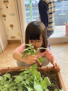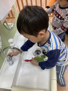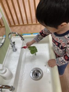 収穫したものを、お水で洗います💦