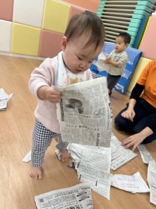 新聞紙の写真を指差して「ママ」「じーじ」など