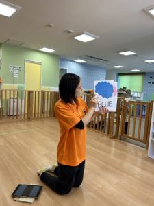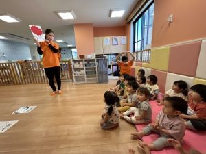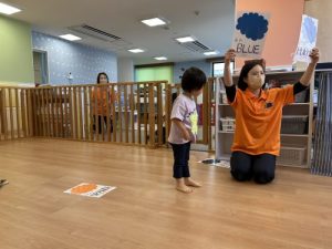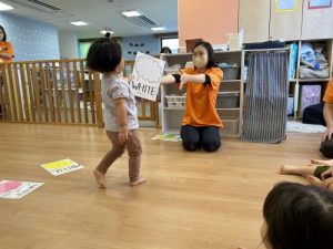 まずは、保育者の後に続いて色の名前を英語で発音してみます。
