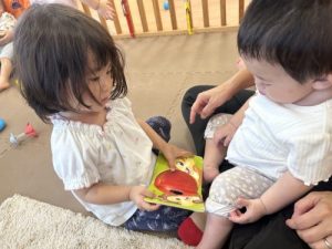 いちご組さんが、もも組さんに絵本を読んであげています
