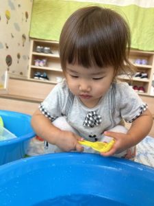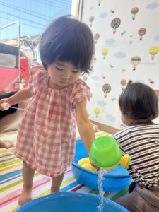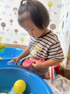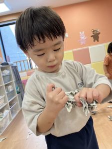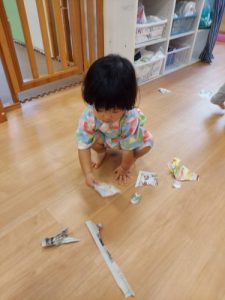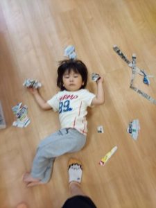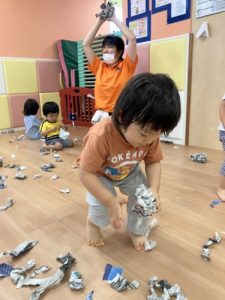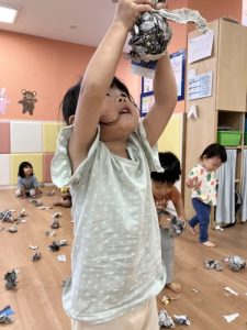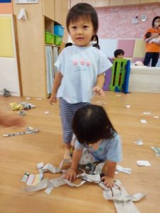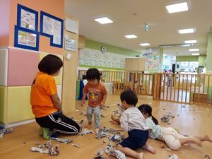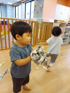 水遊びが出来ない日、りんご組はフリースペースを使って新聞紙遊びをしました❗️