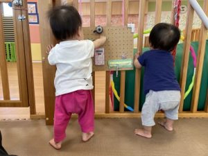 つかまり立ちをして並んでいる姿が可愛くてパシャリ📸