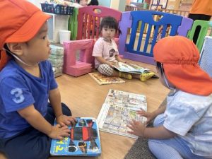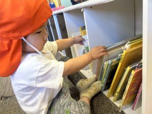 お散歩の前は、本棚から好きな絵本を選んで読んでいます
