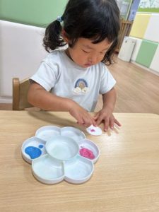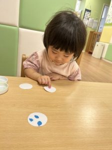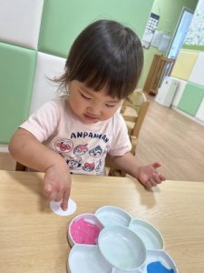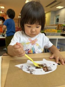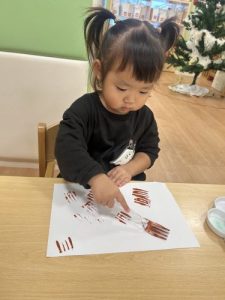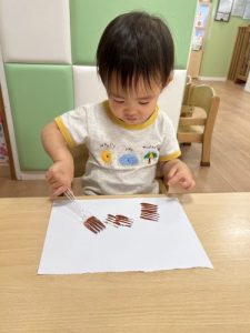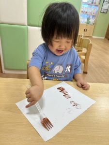 りんご組はフォークの持ち方を色々試しながら、力強くスタンプしていました‼️