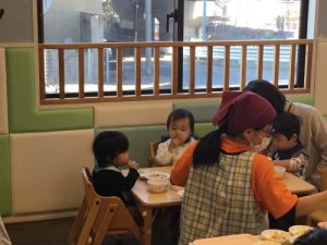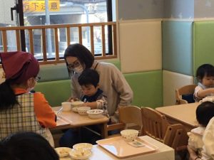 ご飯の時間では、1人で食べられるよ❗️と手掴み食べを披露したりスプーンを上手に使ったりする子もいました