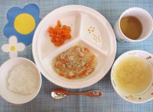 (写真は離乳食後期です。年齢によって形、固さ、盛り付け量を変えて、提供しています。)