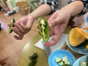 野菜を縦や横など色々な向きで切る事で形が変わる事