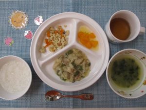 「今日はカレーかな?」とワクワクしている子もいましたが、給食はカレー味の魚のムニエルです♪ カレームニエルは食欲をそそり、おかわりもしました。今日の大人気メニューはマカロニサラダでした!