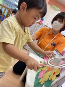 虫眼鏡で昆虫を見つけたら、虫網で捕まえます‼️