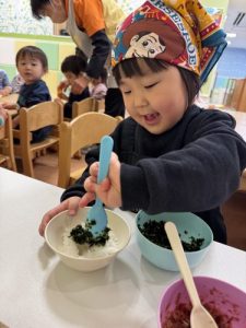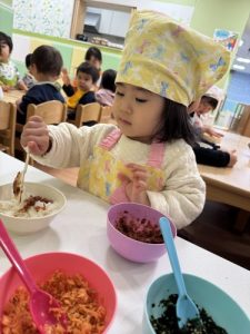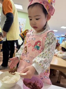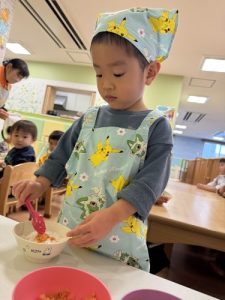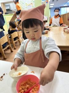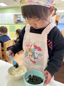 エプロンと三角巾を着けて、今回は「 ふりかけ作り 」