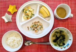 サンライズキッズ保育園 ◎給食の様子 今日は夏にぴったりなさっぱりとした和え物でした。オクラがねばね...