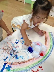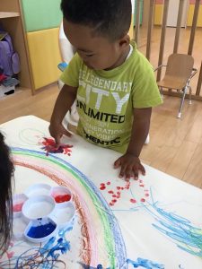 ぺたぺたとスタンプのように押してみたり伸ばしてみたり、絵の具の感触を楽しんでいました!