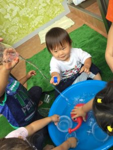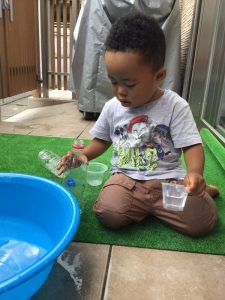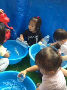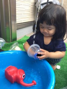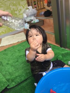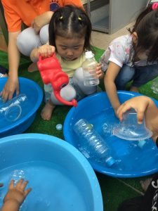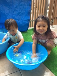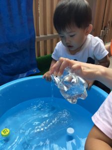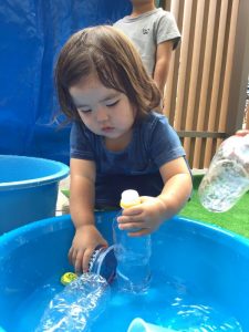 水遊びのためにお家からプリンカップとペットボトルを持ってきてもらいました✨