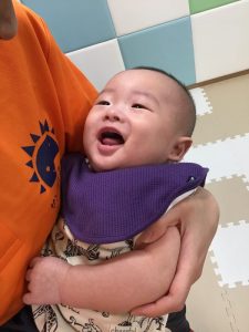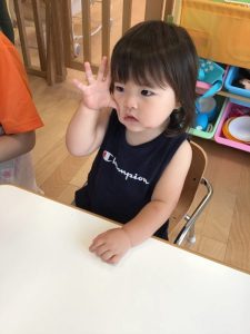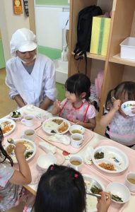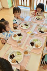 水遊びも室内遊びも思う存分遊んだ後の給食は「おいしい〜?」とモリモリ食べていますよ?