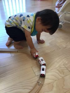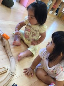 いちご組?さんは線路を作り電車を走らせたりブロックを組み立てたり…
