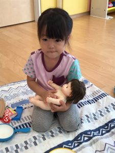 メルちゃんやアンパンマンを抱っこ??抱っこもトントンもとっても上手です✨
