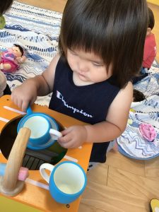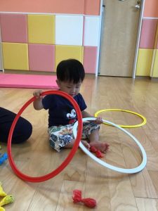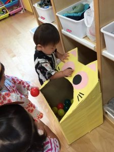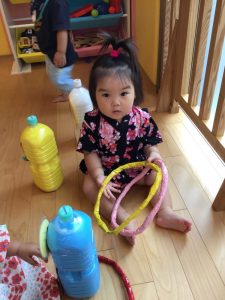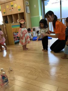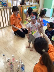 ペットボトルが倒れると先生と「やったね〜!」とタッチ✋