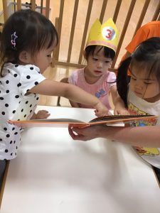 お誕生日会に先生が選んだのは、こぐまちゃん絵本シリーズの中の「おたんじょうびおめでとう」でした!こぐまちゃんも3歳!りんご組さんもこぐまちゃんと一緒の3歳になりましたね✨