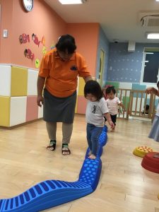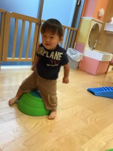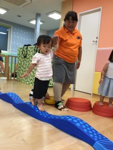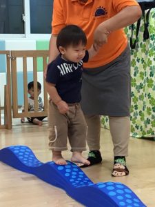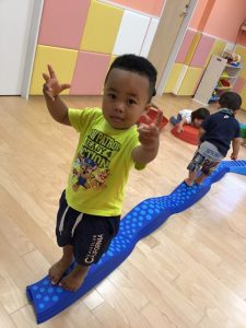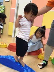 いちご組?さん、4月当初は保育士の手を取りながら一歩一歩慎重に歩き、途中で平均台から落ちてしまうこともありましたが、今ではバランスを取りながら上手に歩けるようになりました♫