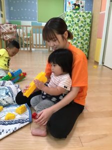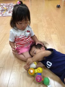 異年齢児での関わりも増えています✨2歳児と1歳児が音楽に合わせて手を繋いで歩いたり、0歳児さんがお部屋で遊んでいるのを見て、ブロックや車の玩具をどうぞと渡してあげたり優しいお友達が沢山いますよ?